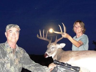 Quick shot off shooting sticks. Amazed Kathy and I that I hit him! A good confidence builder early in my handgun hunting career.