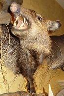 The only sounder in four days. He and the other boar ran up hill after Ben pushed bottom. He stopped and faced me. Shot and hit shoulder low. Chased to next canyon and Marilyn saw him under tree. He was really hiding. Finally saw his snout at 20' and shot.